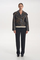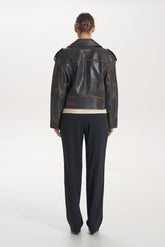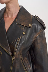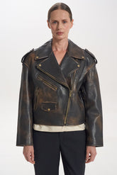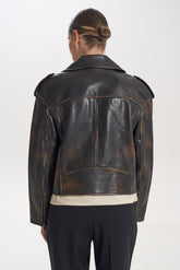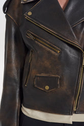 Bunda-křivák s vintage efektem, vyrobená z pravé kůže s patinovaným odstínem. Masivní zipy a kovové detaily dodávají rebelský charakter a dělají z ní výrazný kousek vašeho šatníku.