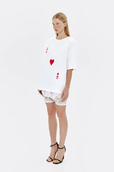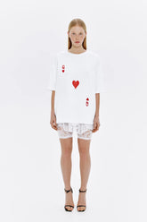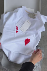 Tričko "queen of hearts" v bílé barvě s výraznými červenými potisky vpředu. Tričko je vyrobeno ve volném oversize střihu, takže je vhodné pro aktivní odpočinek nebo sportování. Toto základní tričko se ideálně kombinuje s každodenními kousky šatníku, jako jsou džíny, kraťasy, legíny, sukně a sportovní oblečení.