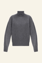 Svetr z vlněné příze s vysokým límcem. Měkký a hřejivý, vyznačuje se originálním výstřihem u límce, který dodává klasickému střihu moderní charakter. Objemné rukávy s jemnými strukturovanými detaily dodávají outfitu výraznost. Ideální volba pro stylový a teplý vzhled.