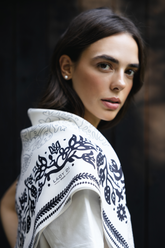 Doplněk v univerzálních barvách s potiskem inspirovaným tradicí. Byl vytvořen technologií rekonstrukce tradičního ručního tisku. Tato technika vytváření ornamentů na látce pomocí řezaných forem byla ve svém vrcholu v 15. století, kdy město Krolevets na Sumštině bylo považováno za centrum tohoto umění. Postup byl následující: dřevěné destičky nebo klišé se namáčely do barvy a poté se tiskly na látku. Každý vzor je ruční práce: od vytvoření formy pro razítko po aplikaci ornamentu na látku. „Základem designu jsou tradiční ukrajinské rostlinné ornamenty vytvořené technikou ručního tisku: stonky s lístky, květinami, hrozny, ptáci,“ říká autorka potisku. Design doplňuje stylizovaný erb jako připomínka domova.
