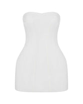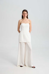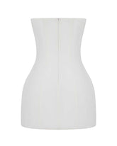 White linen mini dress with exposed shoulders and flared hem. The dress has a corset construction, which thanks to the strong reinforcement holds its shape beautifully and creates an elegant silhouette with a touch of romantic charm. It emphasizes femininity and style, bringing freshness and lightness to the outfit.