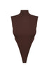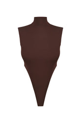 Hnědé body s vysokými výřezy v pase je vyrobené z měkkého žerzeje a má zapínání na háčky.
