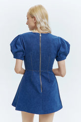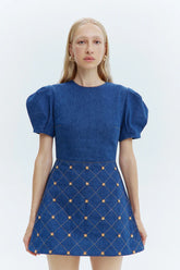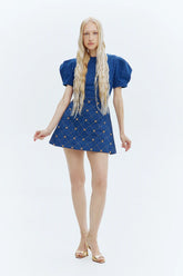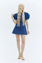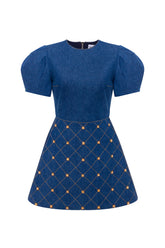 This denim mini dress combines timeless denim fabric with delicate decorative flowers to create a sophisticated and stylish look. Its tailored cut and subtle floral details emphasize the elegance of the dress, making it ideal for occasions where casual meets chic. Perfect for injecting a touch of understated charm into your wardrobe.