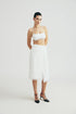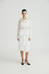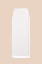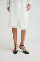 Midi skirt with a crossed wrap cut and a waistband. Button fastening, the skirt hem is decorated with organza around the perimeter, which adds elegance to the design.