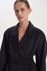 Пальто прямого крою з короткими рукавами. Має бічні кишені та пояс.