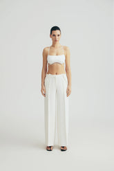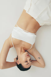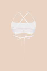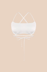 Укорочений топ з фігурним подолом по лінії грудей. Прикрашена вшитими люверсами, через які ззаду протягується та зав'язується тонкий шнурок. Лямки на спині оснащені білизняними регуляторами для зручного регулювання. Топ застібається ззаду на гачки.