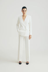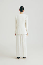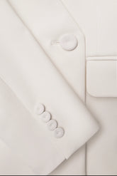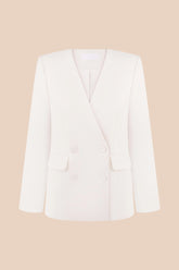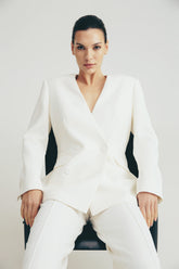 Двобортний приталений жакет з двома рядами гудзиків. Глибокий виріз без лацканів додає мінімалістичний акцент. Формуючі шви на талії підкреслюють силует, а дві горизонтальні кишені з клапаном забезпечують функціональність. Ззаду центральний шов переходить у вентиляційний розріз, а формуючі шви забезпечують структуру та ідеальну посадку. Довгі прямі рукави класичного крою доповнені манжетами із застібкою на чотири гудзики.