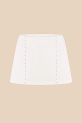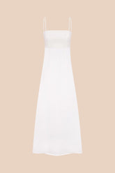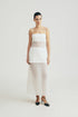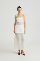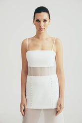 Сукня на тонких бретельках і регулювальниках у стилі нижньої білизни для додаткового комфорту. Виготовлена з напівпрозорої органзи, яка додає образу легкості та жіночності. Доповнюється знімною міні-спідницею А-крою з костюмної тканини. Спереду дві симетричні застібки на всю довжину, прикрашені гудзиками з основної тканини.